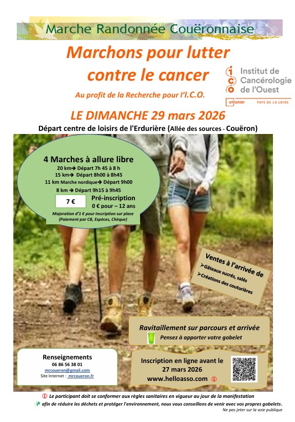 L'édition 2026 de la "Couëronnaise", "Marchons pour la recherche contre le cancer" , aura lieu le dimanche 29 mars 2026. En 2025 plus de 1100 participants ont permis de récolter 15000€ pour l'Institut de Cancérologie de l'Ouest